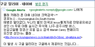 구글뉴스에서는 특정 검색어가 들어간 뉴스가 올라올 경우에 이메일로 알려주는 뉴스 알리미 서비스를 제공하고 있다. “네이버”라는 검색어도 지정해 두었기 때문에 관련뉴스가 등록되면 이메일로 날아온다. 제목과 내용일부를 보고 관심있는 경우에 클릭하는데 조금전에 도착한 메일을 보니 미리보기가 좀 이상했다.
